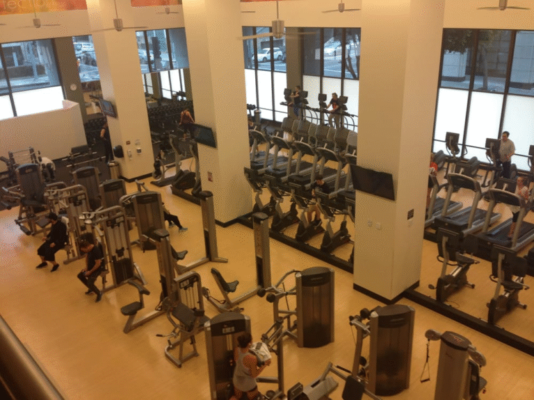 The gym also has cool extras like smoothie bars where you can buy healthy drinks, shops that sell workout gear, and comfy lounges with free internet where you can hang out.
